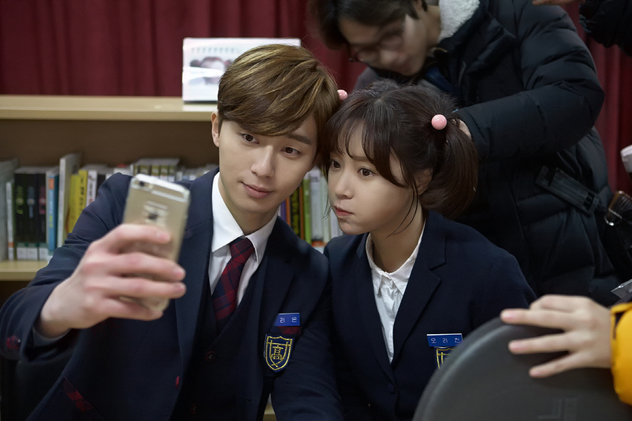 劇中,黃靜茵和朴瑞俊飾演一對外形和性格都完全相反的「雙胞胎兄妹」,一個是精神科初級醫生吳悧珍,一個是神秘主義的天才推理小說家吳悧溫。照片中,兩人穿上校服比著賣萌,自拍得十分起勁。兩人擺出各種情侶常用造型,又是比V、又是仰視45度、又是大特寫,好不開心,讓人好奇劇中兩人換上校服的緣由。